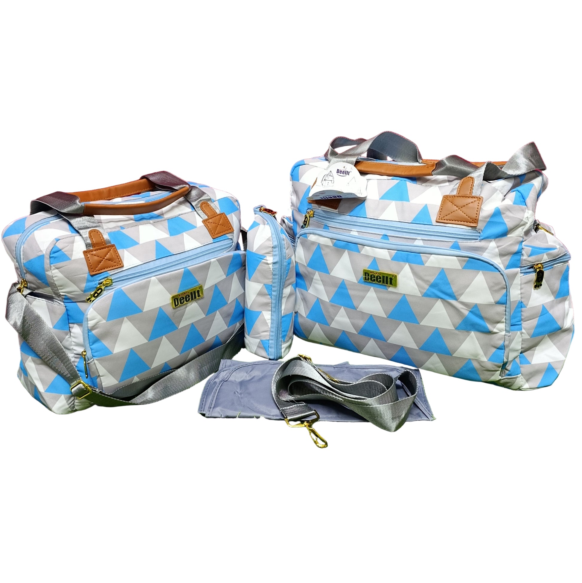 Organize all your baby's essentials in style with this versatile "Bag Deellt Triangle" diaper bag set. This set includes multiple bags with a modern geometric triangle pattern. It features a spacious main bag for diapers, bottles, and toys, and a smaller matching bag for quick outings or separate items. The bags are designed for convenience and are a great way to keep everything you need organized and accessible while on the go.