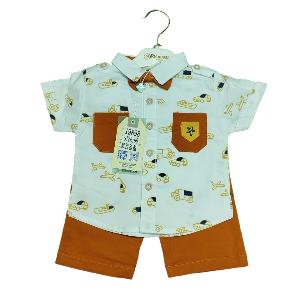 Dress your little one in this cheerful and comfortable two-piece short-sleeve suit! The shirt features a delightful all-over print—likely bugs, cars, or miniature objects—perfect for sparking imagination during playtime.