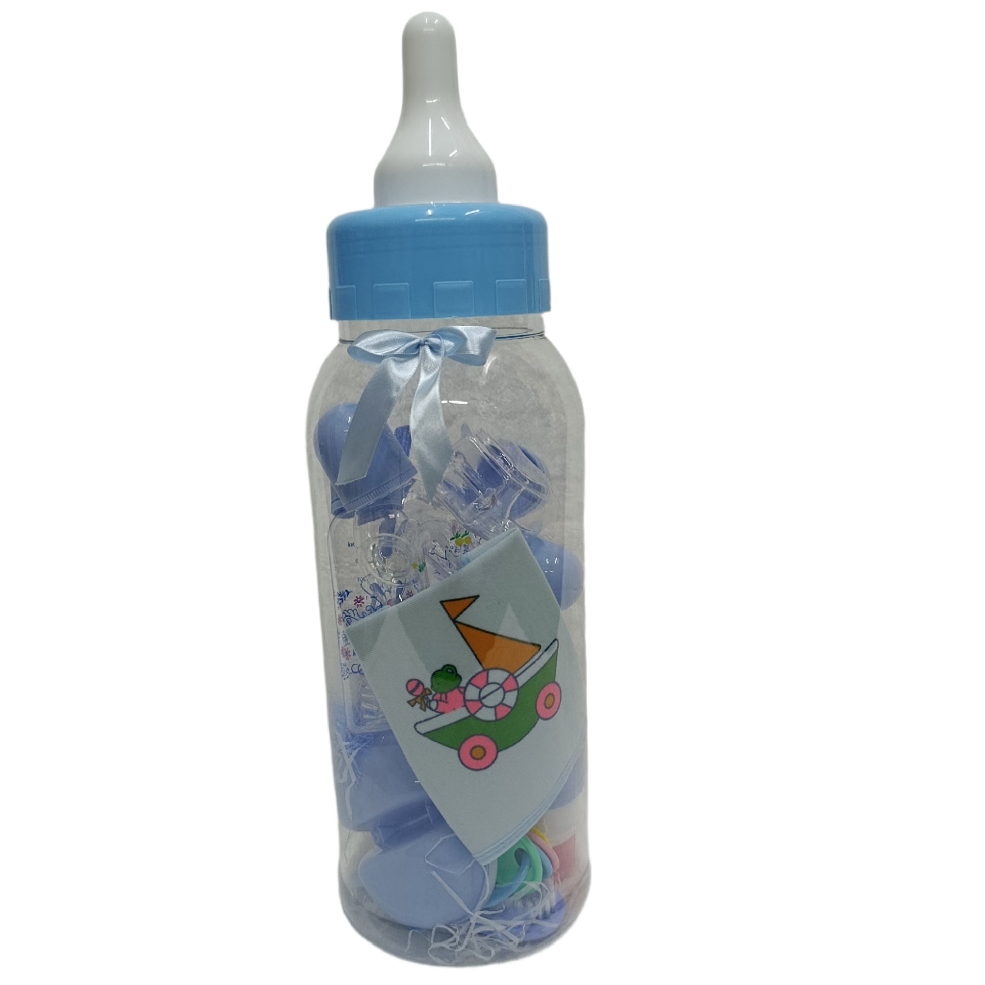 This beautify designed set comes with reusable bottles and includes a feeding bottle, pacifier, bib, spoon and fork set, rattle toy and cleaning brush.