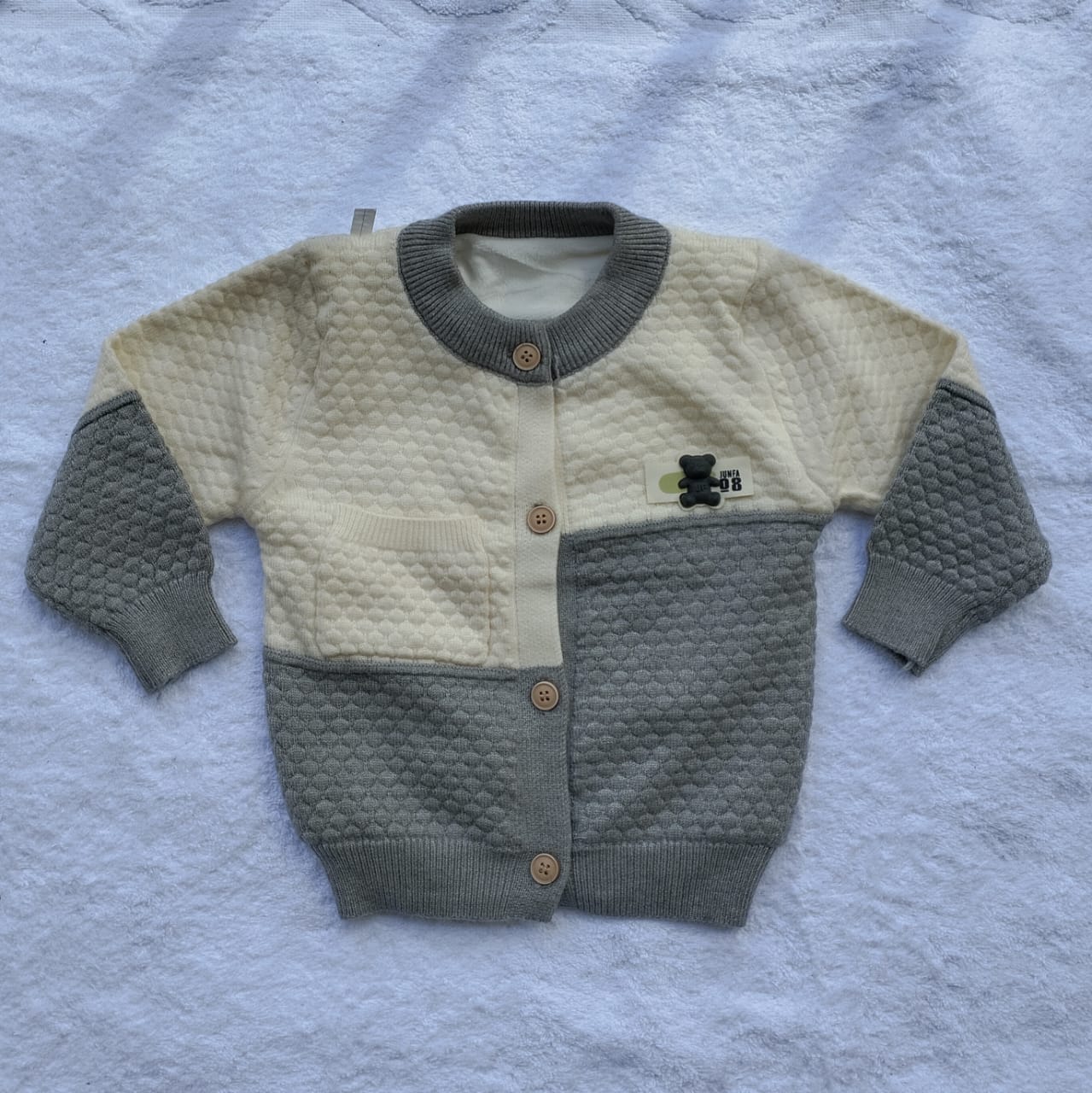 This contemporary cardigan combines stylish design with the gentle comfort essential for newborns and infants. Crafted from a super-soft knit, it features a trendy color-block design with two distinct colors, split horizontally and vertically, giving it a modern, patchwork appeal.