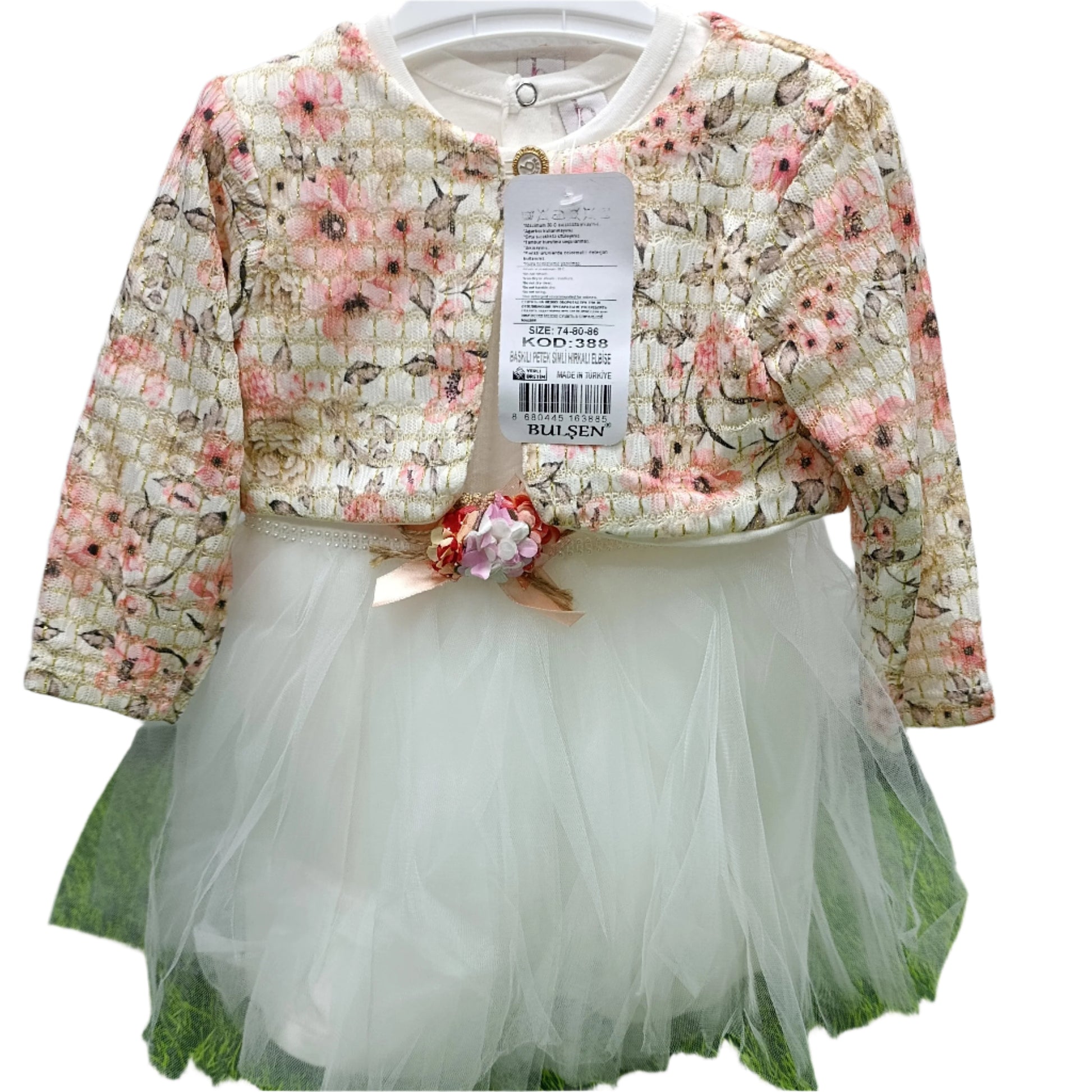 The tulle dress features a soft inner lining to ensure the fabric remains comfortable against your baby's delicate skin. The cozy, decorated bolero adds warmth and a luxurious texture, making this set perfect for special occasions year-round.