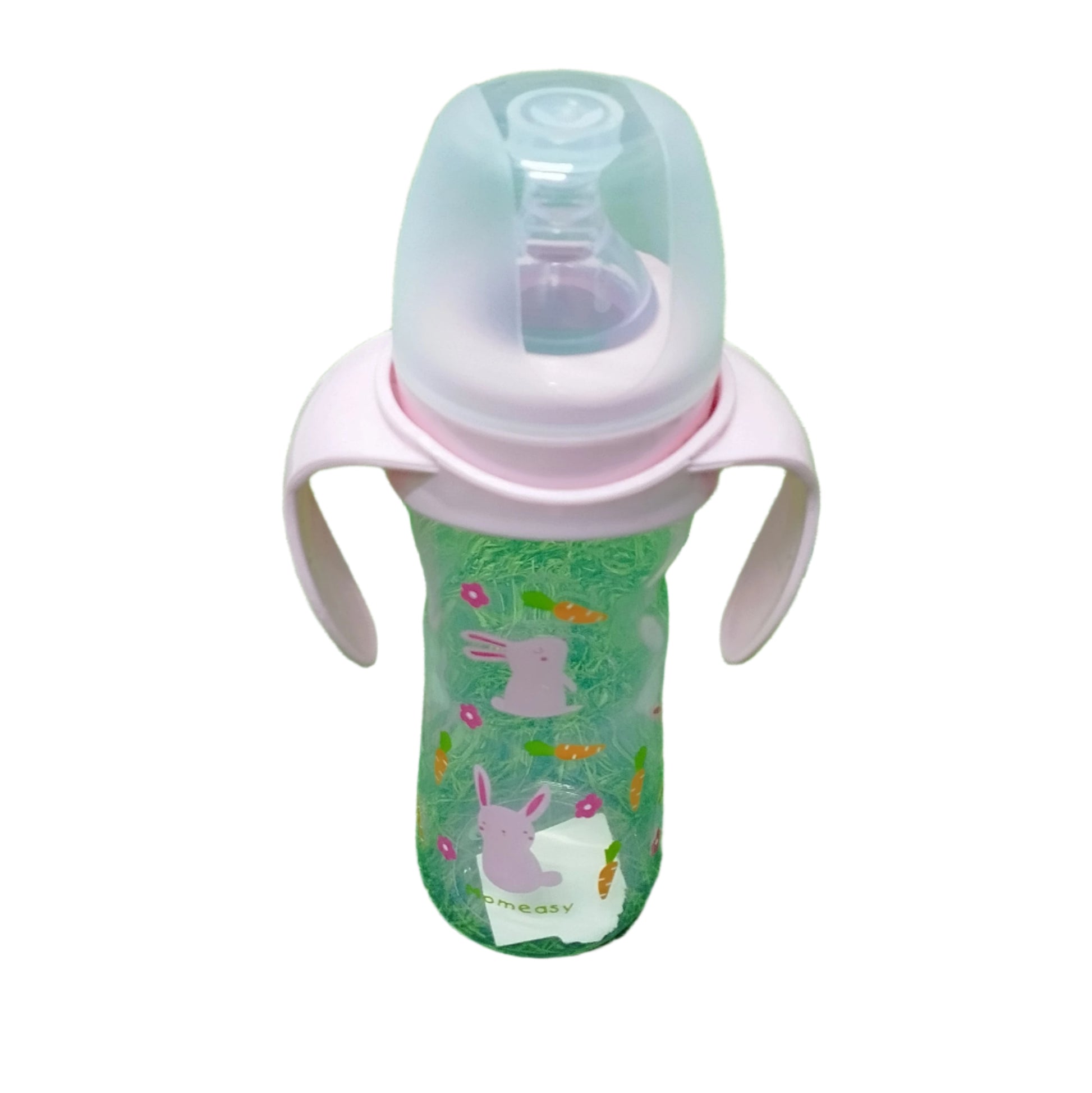 The most distinguishing feature is the set of easy-grip handles, which are perfectly sized for small hands, helping the baby hold the bottle independently. The bottle body features a clear design with cute cartoon/animal prints.