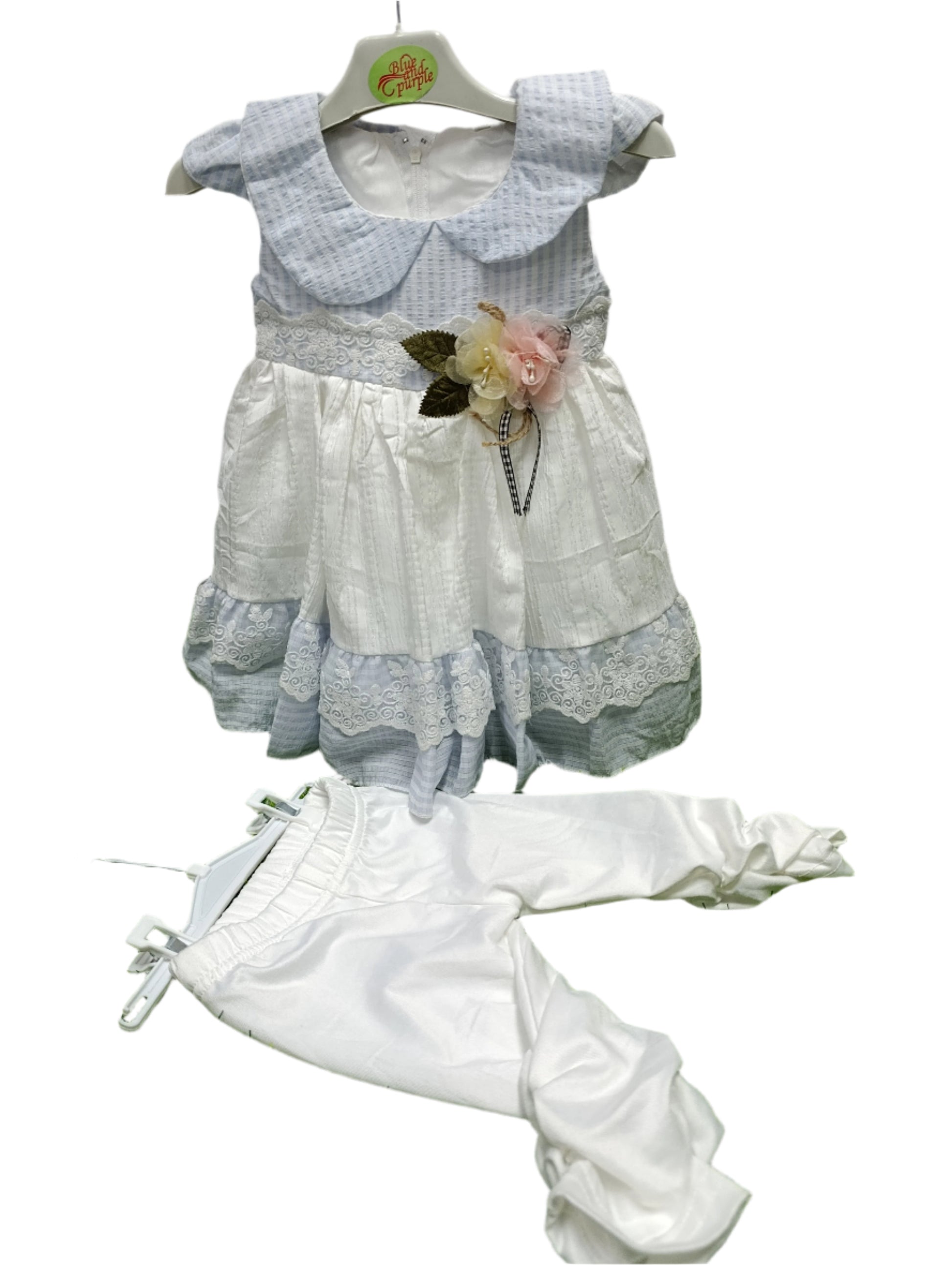 Make your little girl shine in this adorable striped dress, designed for style and comfort. Featuring a beautiful blue and white striped design with lace detailing and floral embellishments, this dress is perfect for parties, birthdays, and casual outings.