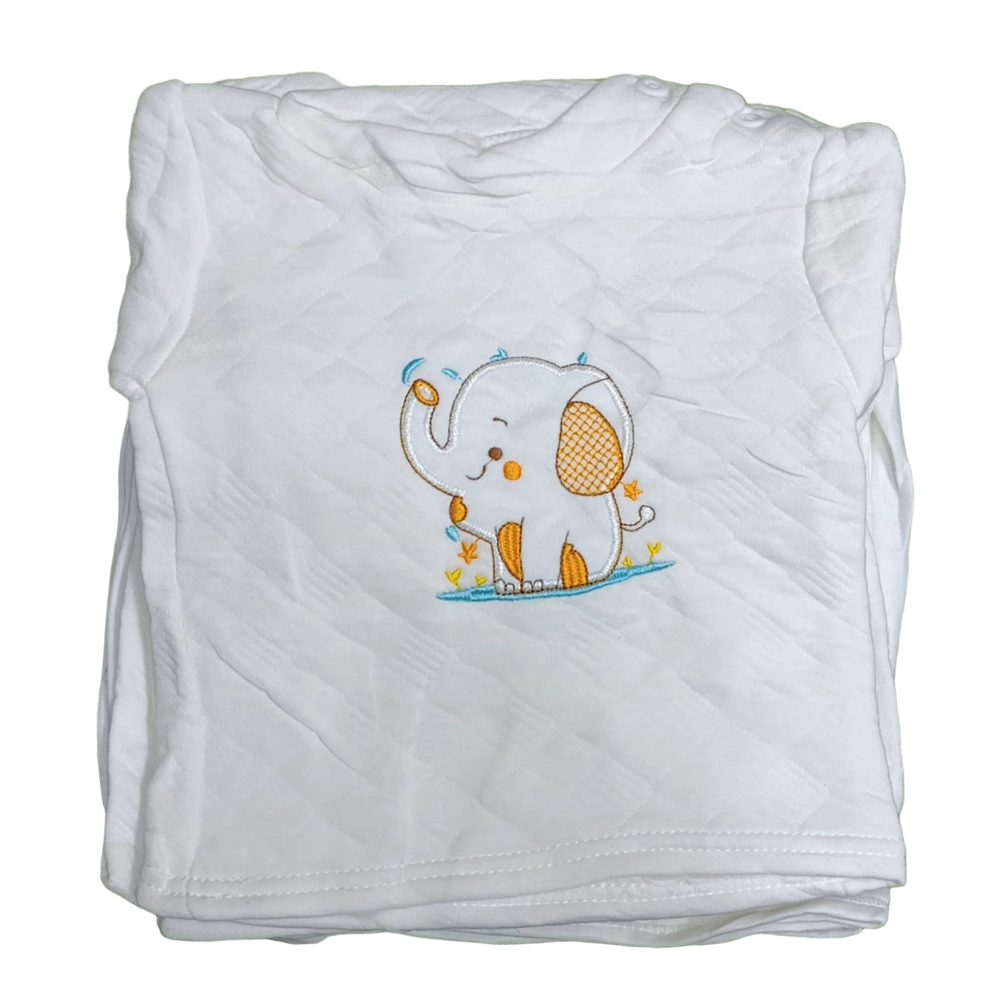 Sweet Elephant Detail: Adorned with a friendly elephant embroidery on a crisp white background.