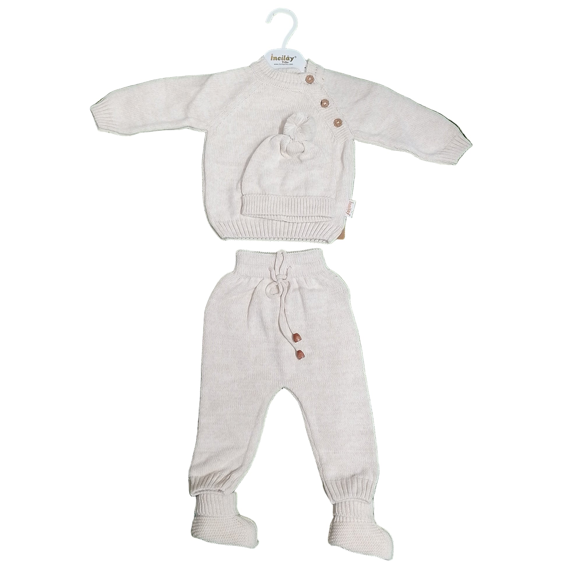 Complete Look: The set is styled with matching knitted accessories, including a drawstring bonnet/hood and adorable knitted booties (sold separately or included as a bonus set, please verify inventory).